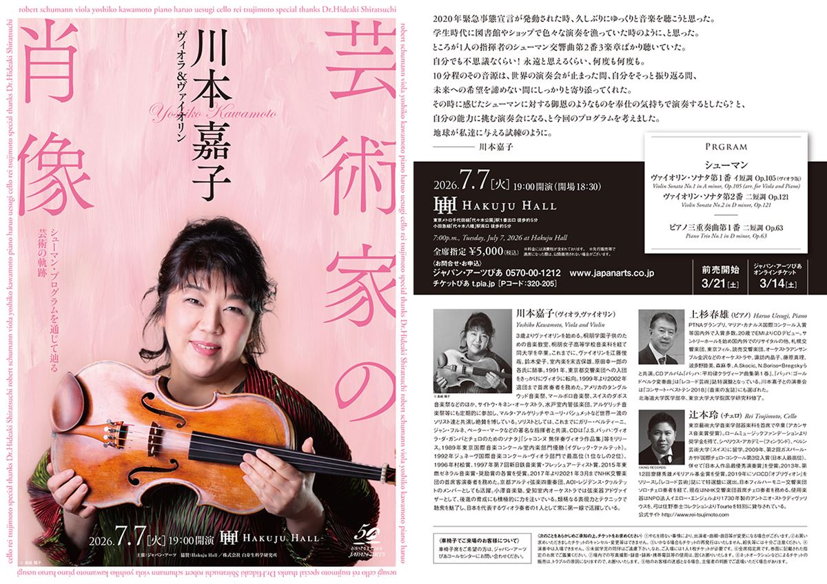 川本嘉子がヴィオラとヴァイオリンを携えオール・シューマン・プログラムに挑む