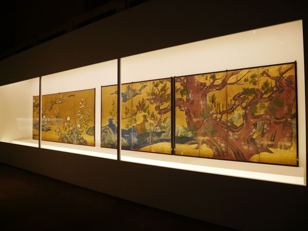 会場に入ってすぐ目を奪われるのが狩野永徳、狩野常信による《唐獅子図屏風》だ。永徳といえば織田信長や豊臣秀吉に取り立てられ、安土城や大坂城などの障壁画を手がけた絵師。約2.2m×4.5mという特大サイズの金屏風に力強い筆致で描かれた唐獅子は大迫力で、続く永徳晩年の作の国宝《檜図屏風》とともに豪壮な桃山文化に圧倒される。