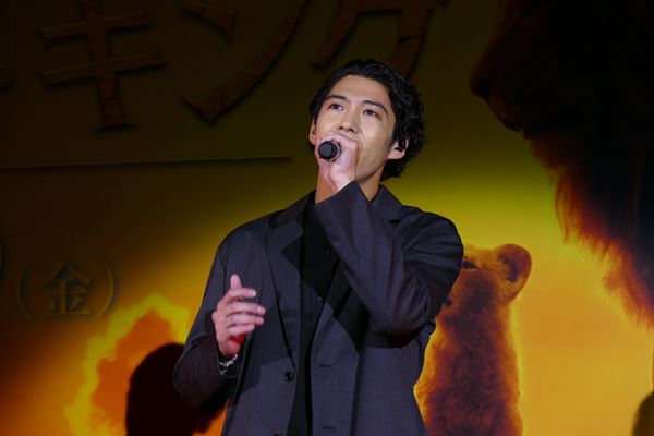 本編の上映を前に、声優を務める賀来賢人(シンバ役)、江口洋介(スカー役)、佐藤二朗(プンバァ役)、お笑いコンビ「ミキ」の亜生(ティモン役)、門山葉子(ナラ役)、大和田伸也(ムファサ役)、日本版オフィシャルソング「サークル・オブ・ライフ」を歌うRIRIが舞台挨拶に登壇。賀来と門山はエルトン・ジョンが作曲、ティム・ライスが作詞を務めた名曲『愛を感じて』を生披露し、息の合った歌声で会場を魅了していた。
