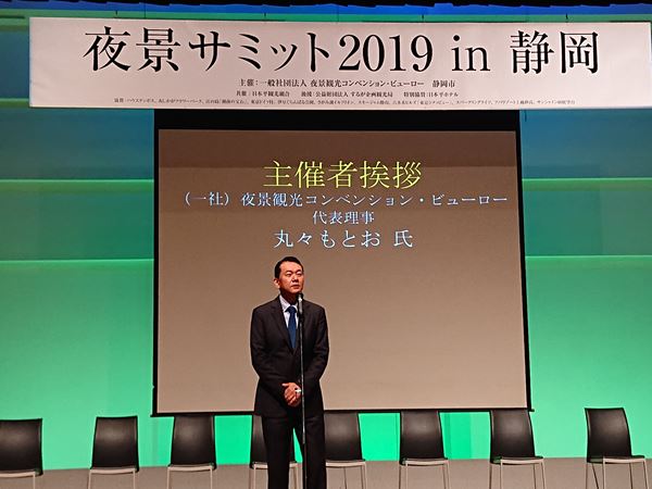 開催地を代表して静岡市長・田辺信宏氏の開会宣言の後、主催の(一社)夜景観光コンベンション・ビューロー代表理事・丸々もとお氏が挨拶。続けて、静岡市 観光・国際交流課の主査・鈴木新一郎氏が、静岡夜景の可能性をテーマに、市内の夜景スポットの魅力と今後の取り組みを語った。