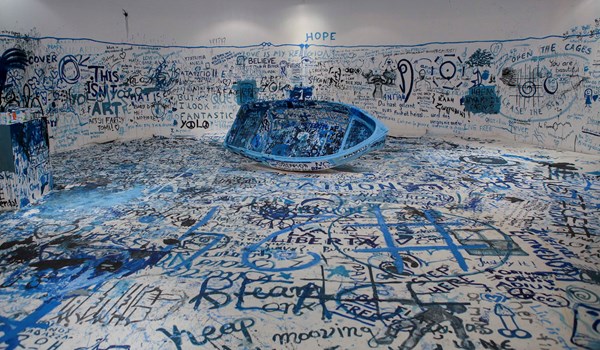 オノ・ヨーコ 《色を加えるペインティング(難民船)》 2016年 ミクスト・メディア・インスタレーション サイズ可変 展示風景:「オノ・ヨーコ:インスタレーション・アンド・パフォーマンス」マケドニア現代美術館、テッサロニキ、ギリシャ、2016年