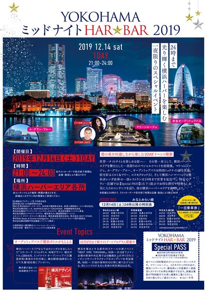 12月4日(土)に横浜で一夜限りのスペシャルイベント「YOKOHAMAミッドナイトHARBAR2019」が開催される。夜の横浜ハーバーエリアを満喫できるイベントが開催され、一部のレストランやイルミネーションは営業時間を24時まで延長する。