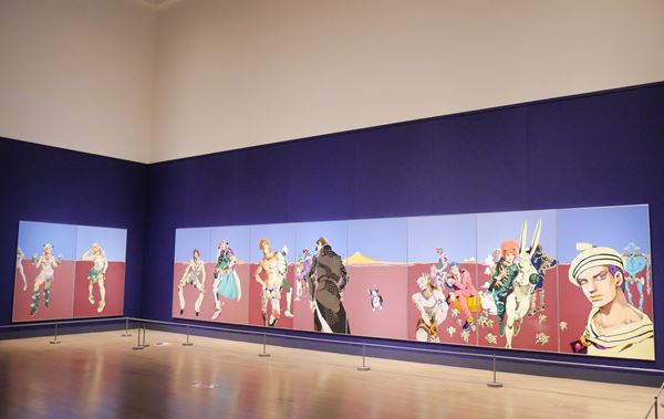 この日、初お披露目となった《裏切り者は常にいる》を前にトークセッションを行なった荒木氏は、「国立新美術館の立派な照明の下で見ると、また違った感じに見えます。DIOの背景色がちょっと濃いんですよね。本当はやり直したいです(笑)」と悔しがりながらも、大型原画の制作意図をこう語った。「見ている人たちが、キャラクターと同じ世界を生きているんだと感じられるように、等身大の作品を制作しました。より一体感を感じてもらうために、一列ではなくコの字型に展示しています」(荒木氏)。
