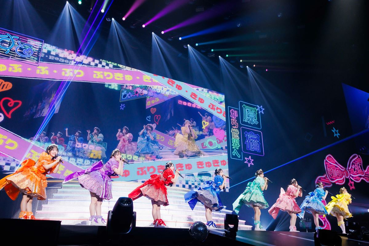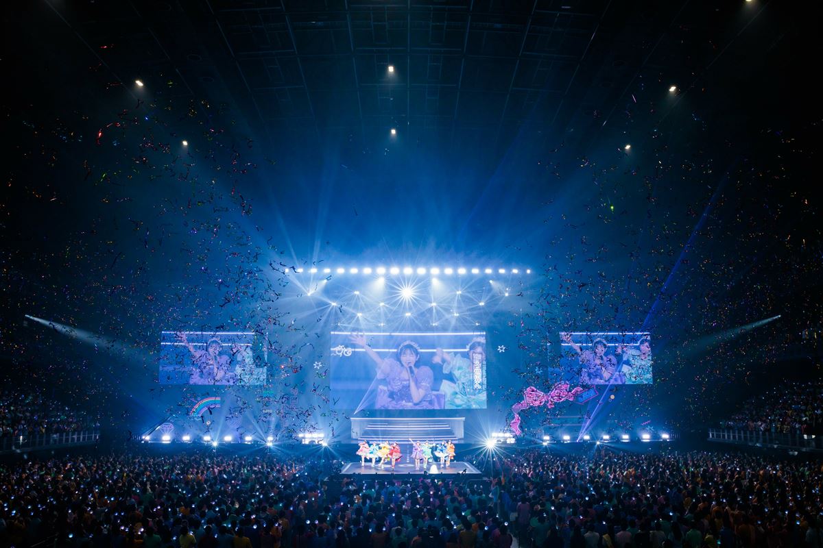 初披露となった新曲「ぷりきゅきゅ」やメンバーも会場も一体となってタオルをブン回した「モアベリサマー」、花道を駆けてセンターステージで飛んで跳ねてステップしてと踊り続けた「ハッピー世界!」、そして佐野のアカペラではじまった「ハロハロミライ」では古澤が感極まって泣き出す一幕も。金色の紙吹雪が舞う中、最後には全員が円になって手を掴み合い、CUTIE STREETの1周年を感動的に締めくくった。
