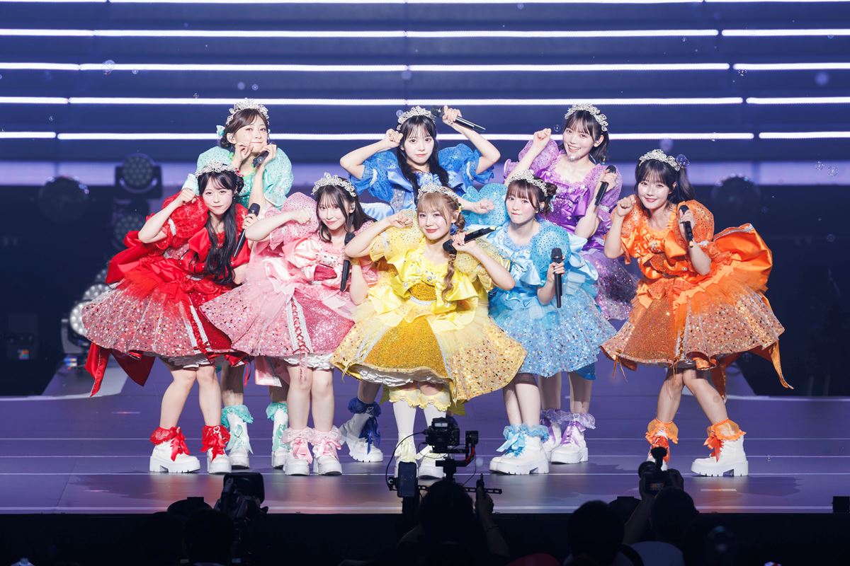 こうして再びステージに登場したCUTIE STREETのメンバーたちは、VCRでも見せた新衣装で登場。オーガンジーの生地にスパンコールをふんだんに縫い付けたミニドレスに背中の大きなリボンが印象的な衣装に着替え、「ちきゅーめいくあっぷ計画」で元気よく登場。センターステージまで駆けていく。シャボン玉が会場を悠々と漂う中でパフォーマンスした「かわいいさがしてくれますか?」、パラパラを踊ったり、「だるまさんがころんだ」がはじまったりで大忙しの「キューにストップできません!」、全員が円陣を組んではじまる「ハルフレーク」まで、明るくかわいく元気のいいパフォーマンスに会場の盛り上がりは最高潮に。そんな中、川本が「何度別の人生を考えてみても、私たち8人はきゅーすとである人生がいいなと思います」と思いを吐露してはじまった「多元幸福論」はこのツアーで初めて披露したCUTIE STREET珠玉のバラード。幸せと生まれ変わりをテーマにした歌詞をしっとりと清らかに歌い上げると、板倉は「この曲を歌うたびに、きゅーすとに出会えてよかったなと思えて、この曲が大好きで大切です」としみじみ語った。