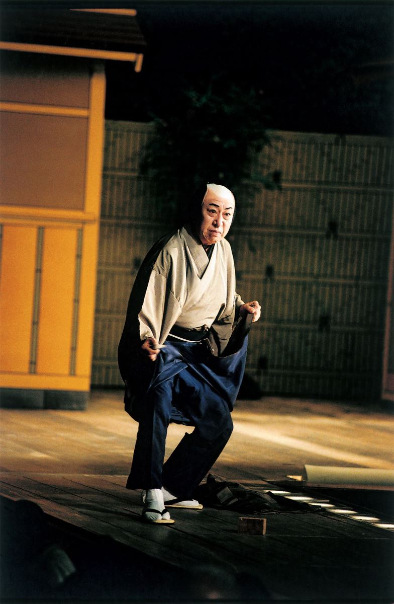 錦吾 その反動で端っこに座っていた吾助はステ~ンと床几から転がり落ちるんですが、ここは五郎蔵と後見とのイキが大事です。この後もう一度奥へ座りますが、転んで着物に泥が着いてしまったので、羽織を脱いで泥を払って畳んでおきます。これ、後の引っ込みでのしぐさにもつながっているんですね。