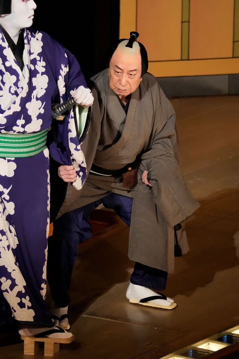御所五郎蔵と星影土右衛門。仲之町で再会した宿敵の二人は、それぞれ子分を引き連れて男伊達の粋と意地を賭けて火花を散らし、本舞台と花道とで華やかな七五調の台詞を交わす。舞台の設定は京の五條坂だが、江戸は浅草吉原あたりの情景が目に浮かぶ台詞の応酬に客席ごと包まれて、実に何とも気分の良い時間だ。そんな侠客たちとは雰囲気のまるで違う男が一人、五郎蔵を追いかけてやってくる。滞っている二百両の支払いの催促にやってきた花形屋吾助だ。