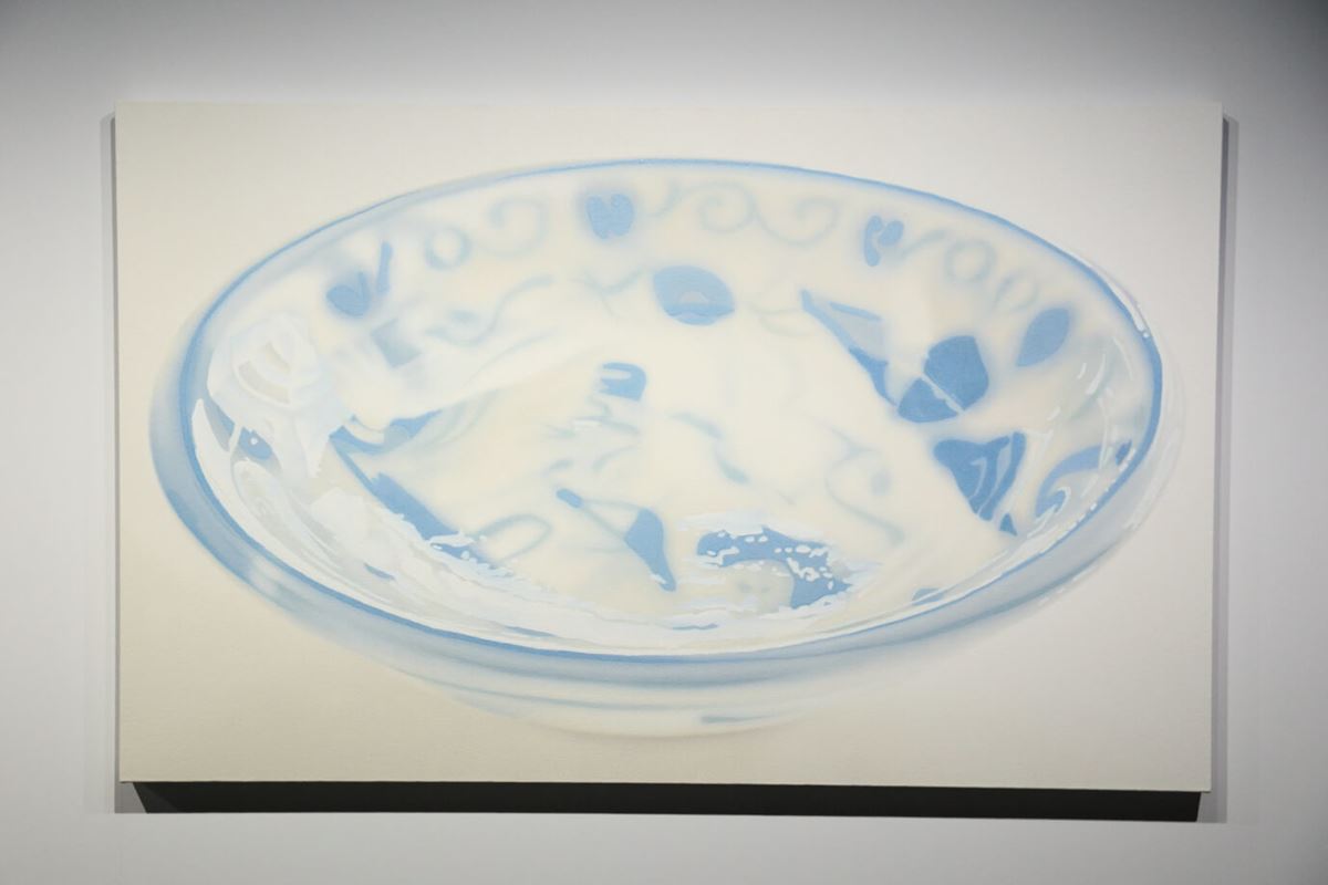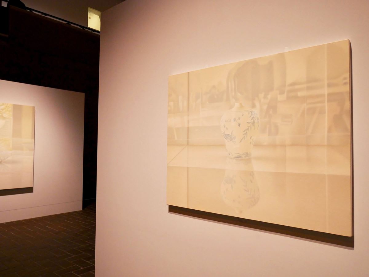 この展覧会のために、東京都美術館で陶器をアクリルボックスに入れて設置し、それを撮影した写真をもとに描いた連作もある。このシリーズの興味深いところは、アクリルボックスの中だけでなく、その外側の空間の映り込みも溶け込み、重なるように描いているところだ。壺の膨らんだ空間にもひとつの世界があり、その後ろのガラス面に映り込んだ鏡像としての壺が異次元を感じさせる。絵のなかを目が距離を変えてさまよっていくうち、虚構と現実が錯綜するようでミステリアスだ。