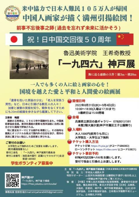魯迅美術学院王希奇教授「一九四六」神戸展 22/8/31(水)~22/9/4(日) 兵庫県立原田の森ギャラリー シェア ツイート 完成まで5年半!胸に迫る感動の大作!縦3m横20mに描かれた1946年の真実!日本人難民の運命は? 開催情報 ジャンル 美術館 1最終日(9/4)は15時まで2大学院生・大学生以下は入館料無料 詳細は https://free.yokatsu.com/koube/ (→「一九四六神戸展」から検索可)をご覧下さい。 料金 一般-1,000円 表示できるチケット情報はありません詳しくはこちら お問い合わせ 「一九四六」神戸展実行委員会事務局 シェア ツイート