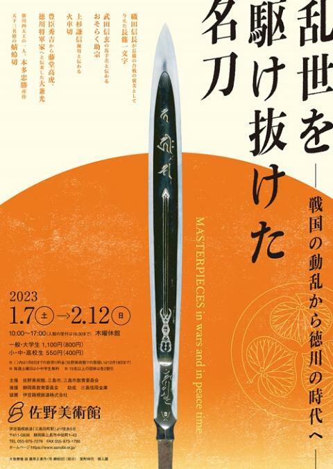 乱世を駆け抜けた名刀 -戦国の動乱から徳川の時代へ- 23/1/7(土)~23/2/12(日) 佐野美術館 シェア ツイート 開催情報 ジャンル 美術館 開館時間=10:00~17:00。入館は閉館の30分前まで。木曜休館。未就学児童無料。毎週土曜日は小中学生無料。購入後の払い戻し不可、開催期間中1枚につき1回のみ有効。 料金 前売券・大人-800円 前売券・小人-400円 当日割引券・大人-990円 当日割引券・小人-500円 前売券・小人-高校生以下 当日割引券・小人-高校生以下 表示できるチケット情報はありません詳しくはこちら お問い合わせ 佐野美術館 公式サイト シェア ツイート
