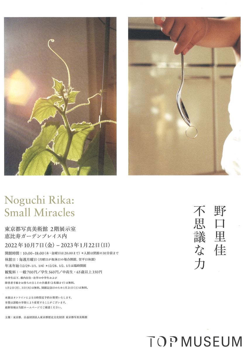 このたび東京都写真美術館では「野口里佳 不思議な力」展を開催する。野口里佳は1995年「写真3.3㎡(ひとつぼ)」展と1996年「写真新世紀」展でのグランプリ受賞以降、〈フジヤマ〉(1997年–)、〈飛ぶ夢を見た〉(2003年)、〈太陽〉(2007–08年)、〈夜の星へ〉(2014-2015年)などの写真・映像作品を国内外の展覧会で発表し、国際的にも高い評価を受けている写真家だ。野口はこれまでに、水中や高地、宇宙といった未知の領域と人間との関わりをテーマにした作品を手がけてきた。近年では、日常や周囲に満ちる無数の小さな謎の探求を通して、見るものの感覚や想像を解き放つような表現を追求している。写真と映像、ドローイングによって構成される本展は、初期作品《潜る人》(1995年)から最新作《ヤシの木》(2022年)までを出品作品に含み、時間や場所も超えていく写真の「不思議な力」に導かれるように、野口がこれまでに出会ってきた様々な現象や光景が描き出されます。その独自の作品表現に触れることは、それぞれの存在がこの世界に生きていることの意味を見つめ直し、また写真・映像のもつ「不思議な力」とは何なのかを考えるきっかけとなることだろう。