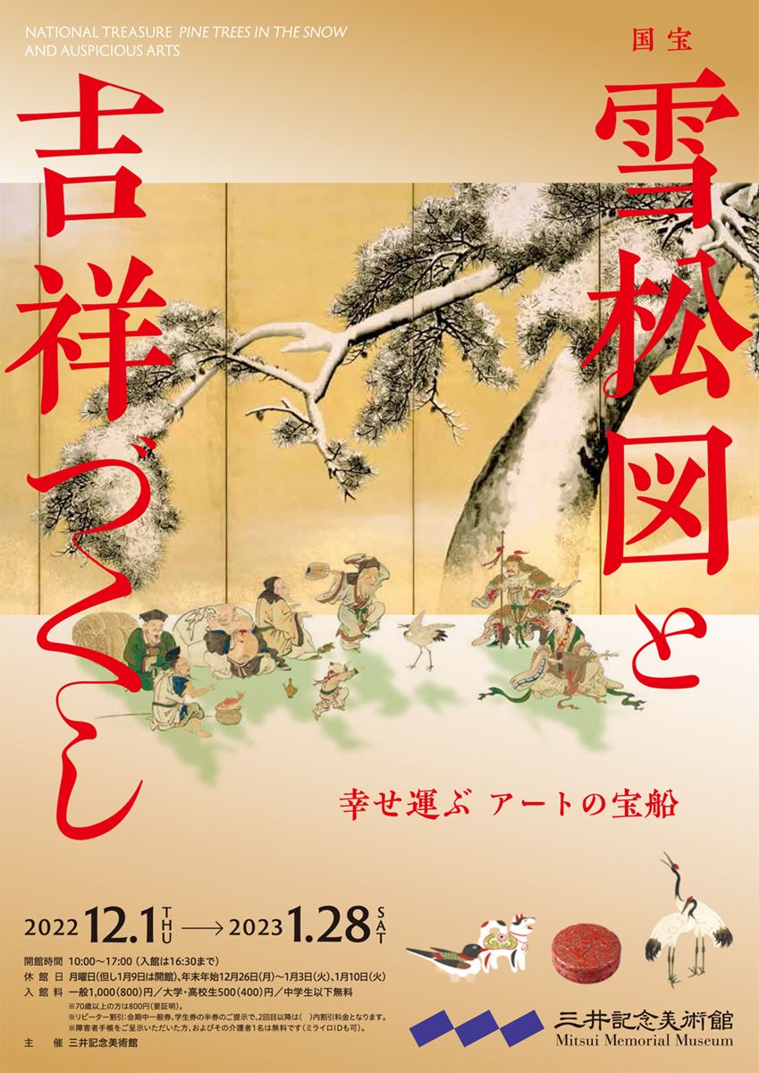 本展覧会では「雪松図屏風」を、お正月らしい鶴や七福神といった、縁起のよい主題の館蔵品とあわせて展示することで、「おめでたい絵画」としての一側面に光を当てる。また猫や瓜、牡丹など、あまり現代人には「おめでたい」イメージのないモチーフに関しても、かつてそれらが担っていた吉祥イメージを解き明かし、なぜおめでたいと見做されたかについて紹介する。何かと心の落ち着かない世情ではございますが、縁起物の描かれた作品の数々から少しでも、明日への活力を得ていただければ幸いである。