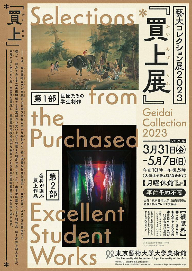 「買上」とは、東京藝術大学が卒業および修了制作の中から各科ごとに特に優秀な作品を選定し、大学が買い上げてきた制度。遡って、前身である東京美術学校でも卒業制作を買い上げて収蔵する制度があった。本学が所蔵する「学生制作品」は1万件を超えるが、本展ではその中から約100件を厳選し、東京美術学校時代から現在にいたる日本の美術教育の歩みを振り返る。
