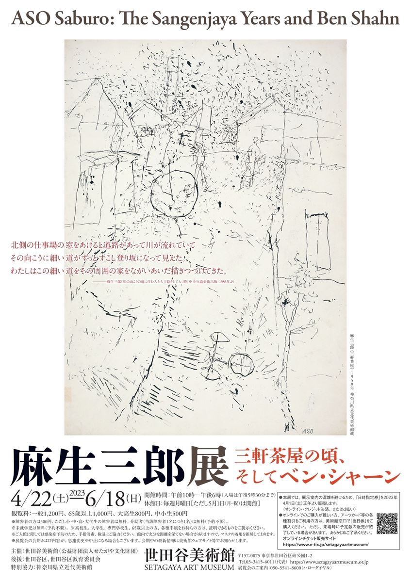 麻生三郎が描きだした時代の景色、そして深々と共感したベン・シャーン作品をあわせてご覧いただき、その重なり合いを今、味わっていただければと思う。
