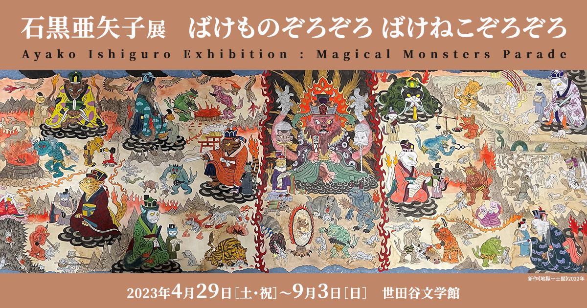 化け猫や妖怪、想像上の生き物を、日本画を想起させる流麗な筆致で描きだす絵描き・石黒亜矢子。 石黒さんの描く生き物たちは色彩豊かに美しく愛らしく、ユーモアたっぷりで、ときにちょっぴり不気味な表情をたたえて瞬く間に私たちを異世界へと誘う。 初の大規模個展となる本展では、画業の最初期の妖怪絵をはじめ、『いもうとかいぎ』『えとえとがっせん』『ねこまたごよみ』などの絵本原画を中心に、描きおろしの新作約20点を含む500点あまりを展示。ぬいぐるみ作家・今井昌代さんとの特別展示、雅太郎玩具店による『いもうとかいぎ』モチーフの新作にも注目だ。 石黒さんの描く魑魅魍魎(ちみもうりょう)が跳梁跋扈(ちょうりょうばっこ)するあやかしの世界をお楽しみいただきたい。