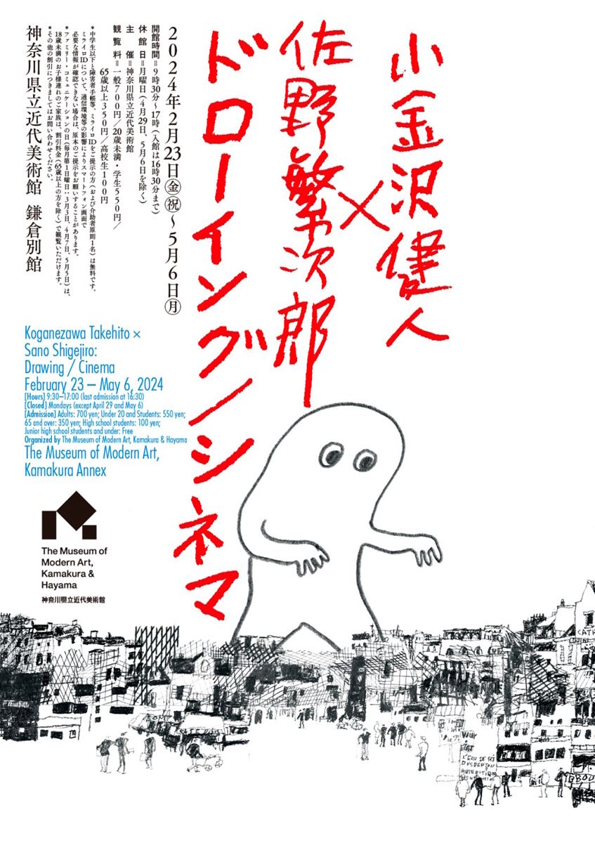 線を引いて像(イメージ)を描き出す「ドローイング」は、カット/イラストレーションとどう異なるのか? イメージの連なりがもたらす動きの感覚とは?新作の映像の原画として今回の展示では、小金沢健人が美術館所蔵の佐野繁次郎作品に目を通し、みずから数百点をセレクトした。映画のワンシーンを思わせる洒脱なイメージで物語を広げる佐野のカット原画をもとに、小金沢が、時間と空間、平面と立体へと展開する新作のインスタレーションを作り出す。
