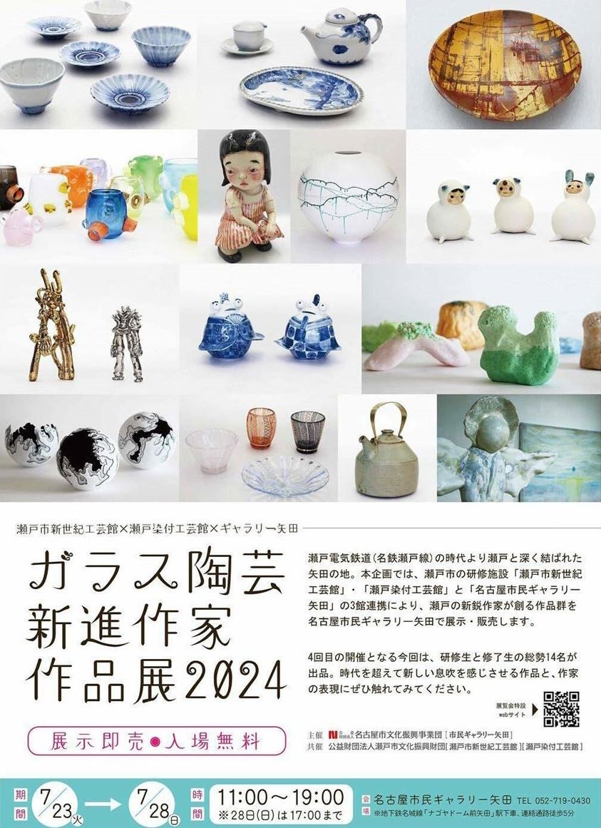 ガラス陶芸新進作家作品展2024 24/7/23(火)~24/7/28(日) 市民ギャラリー矢田 シェア ツイート 瀬戸市新世紀工芸館・染付工芸館の協力のもと、瀬戸の街で腕を磨いた若手作家の新作を展示する「ガラス陶芸新進作家作品展」を今年も開催!作品はすべて作家直売価格で展示販売を行う。ぜひお越しいただき、手に取って触れてみてほしい。個性あふれるオブジェから日常で使える食器、小物などの実用的なものまで、たくさんの作品が出品! 開催情報 ジャンル ギャラリー 11:00〜19:00無休 ※28日(日)は17:00まで 料金 無料 お問い合わせ ギャラリー矢田 公式サイト シェア ツイート