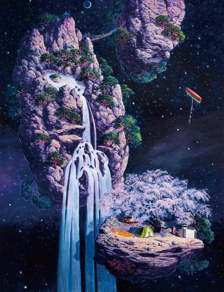 Stephen Wong Chun Hei / The Space Sakura with Infinity Falls / 130.0 x 100.0 cm / Acrylic on canvas