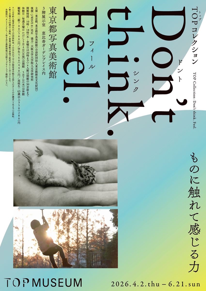 令和8(2026)年度第一期のテーマは、AI時代における「感触」。「感触」とは狭い意味での触覚だけではなく、「ものに触れて感じること」を指す。現代では人工知能(AI)の急速な社会進出によって、これまで人間に特有のものとされてきたさまざまな技術や能力の優位性が揺らいでいる。こうした時代背景においてこそ、真の人間力について考えることに意義があるはずである。このコレクション展では、文化、芸術に特有の共感覚や、感性的なコミュニケーション、想像力の可能性を考える。「感じること」の重要性を説いた香港の武術家・俳優・哲学者ブルース・リー (1940-73)の言葉「Don’t think. Feel.(考えるな、感じろ。)」を手掛かりとして、同館の写真作品から五感を触発する作品を選んだ表題のセクションを中心に、短編小説集のように5つの小テーマで構成するオムニバス形式の展覧会だ。