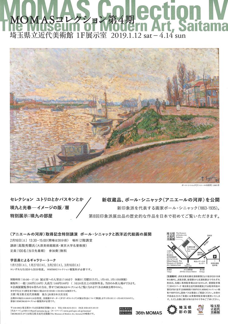 MOMASコレクション第4期 19/1/12(土)~19/4/14(日) 埼玉県立近代美術館 シェア ツイート 開催情報 ジャンル 美術館 10:00~17:30 (入場は17:00まで)、月曜休(ただし、1/14、2/11は開館) 料金 一般200円 、大高生100円 ※中学生以下、障害者手帳を提示の方 (付き添いの方1名を含む) は無料。※企画展観覧券をお持ちの方は、併せてMOMASコレクションも鑑賞可能(各企画展会期中のみ) 出品作家 モーリス・ユトリロ ポール・シニャック 瑛九 シェア ツイート