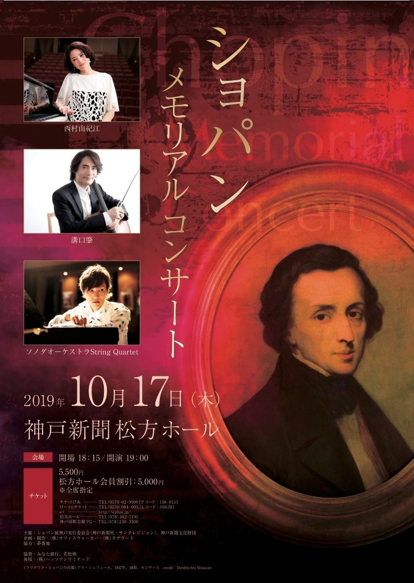 ショパンメモリアルコンサート 19/10/17(木) 神戸新聞松方ホール シェア ツイート 西村由紀江が中心となり、ショパンの命日に関西に所縁のあるアーティストが集結しショパンの珠玉の名曲を各々の解釈、アレンジでコラボレーションし、奏でるスペシャルな一夜。どこかで耳にした音楽も同時に体感できるポップスコンサートです。 公演情報 ジャンル ピアノ・鍵盤楽器 器楽 室内楽 料金 全席指定一般-5,500円 表示できるチケット情報はありません詳しくはこちら キャスト&スタッフ ピアノ 西村由紀江 チェロ 溝口肇 ソノダオーケストラ String Quartet 公式サイト シェア ツイート