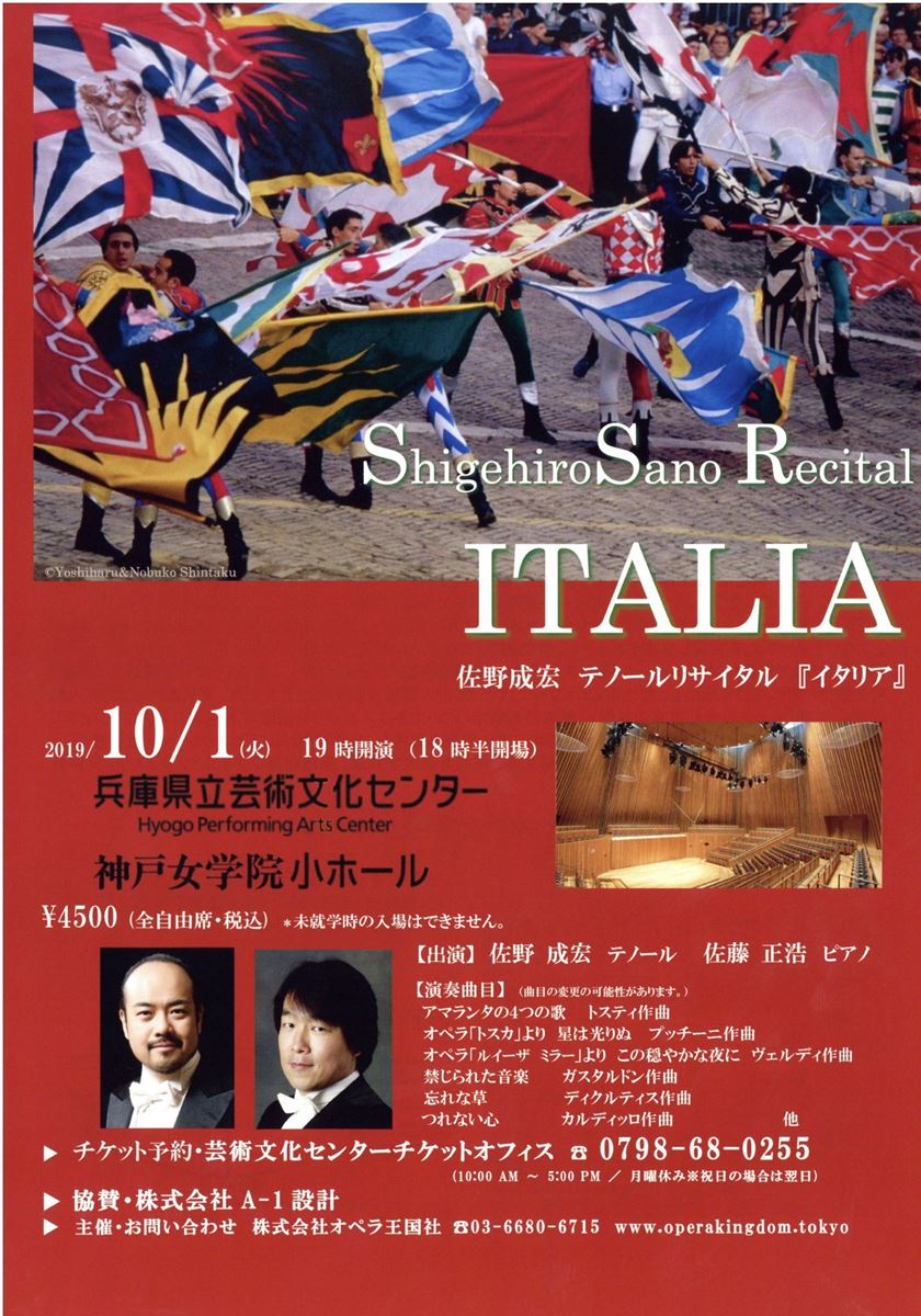 佐野成宏テノール・リサイタル 「イタリア」 19/10/1(火) 兵庫県立芸術文化センター 神戸女学院 小ホール シェア ツイート 北イタリアから南イタリアまで多くの作曲家が生まれたイタリアは芸術の国! トスティ:アマランタの4つの歌/プッチーニ:歌劇『トスカ』より“星は光りぬ”/クルティス:忘れな草 公演情報 ジャンル 声楽 料金 自由-4,500円 キャスト&スタッフ テノール 佐野成宏 ピアノ 佐藤正浩 お問い合わせ (株)オペラ王国社 公式サイト シェア ツイート