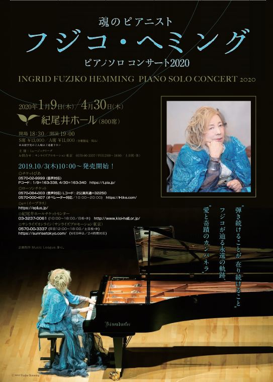 【公演延期】フジコ・ヘミング ピアノソロコンサート2020 20/4/30(木) 紀尾井ホール シェア ツイート リスト:ラ・カンパネラ 他 公演情報 ジャンル ピアノ・鍵盤楽器 未就学児童は入場不可。 料金 S席-13,000円 A席-11,000円 表示できるチケット情報はありません詳しくはこちら キャスト&スタッフ ピアノ フジコ・ヘミング お問い合わせ サンライズプロモーション東京 シェア ツイート