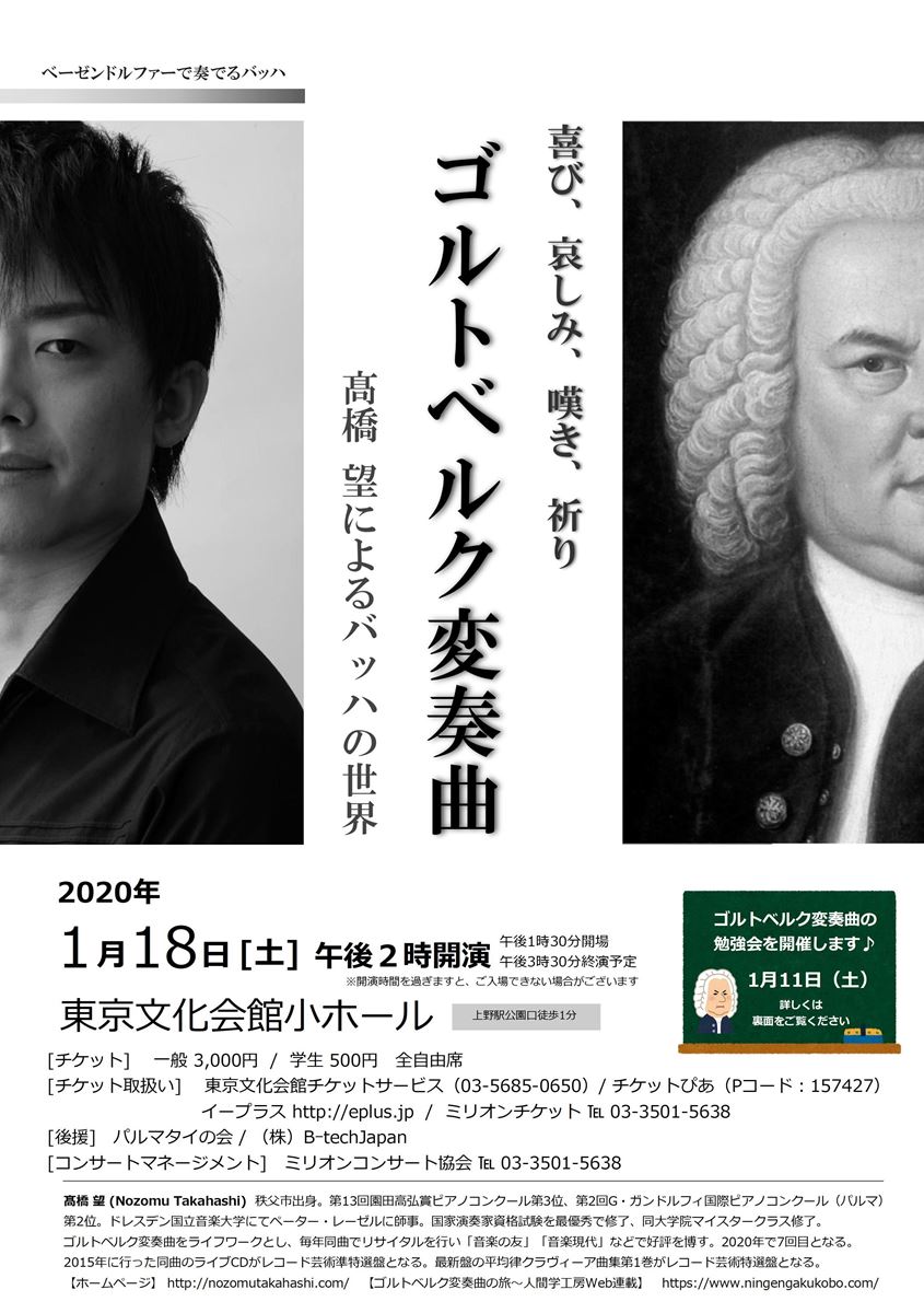 ゴルトベルク変奏曲2020 高橋望によるバッハの世界 20/1/18(土) 東京文化会館 小ホール シェア ツイート 高橋望のライフワーク バッハ:ゴルトベルク変奏曲 公演情報 ジャンル ピアノ・鍵盤楽器 料金 全席自由 一般-3,000円学生-500円 表示できるチケット情報はありません詳しくはこちら キャスト&スタッフ ピアノ 高橋望 お問い合わせ (株)ミリオンコンサート協会 公式サイト シェア ツイート