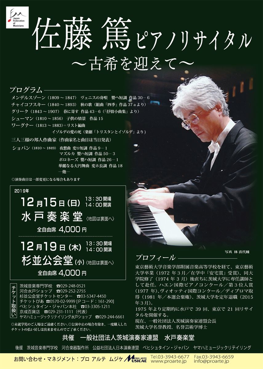 佐藤 篤 ピアノリサイタル〜古希を迎えて〜 19/12/19(木) 杉並公会堂 小ホール シェア ツイート メンデルスゾーン:ヴェニスの舟唄 作品30-6/チャイコフスキー:秋の歌(組曲「四季」作品37aより)/グリーク:春に寄す 作品43-6/シューマン:子供の情景 作品15/ワーグナー=リスト:イゾルデノ愛の死/三人三様の邦人作曲家/ショパン:夜想曲 作品9-1、マズルカ 作品50-3、ポロネーズ 作品26-1、華麗なる大円舞曲 作品18 ほか 公演情報 ジャンル ピアノ・鍵盤楽器 料金 全席自由-4,000円 表示できるチケット情報はありません詳しくはこちら キャスト&スタッフ ピアノ 佐藤篤 お問い合わせ プロ アルテ ムジケ 公式サイト シェア ツイート