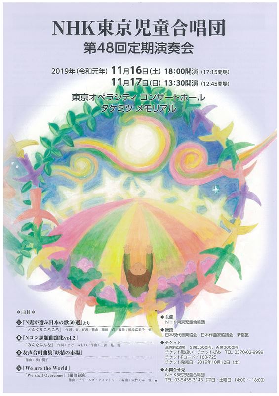 NHK東京児童合唱団 第48回定期演奏会 19/11/16(土)~19/11/17(日) 東京オペラシティ コンサートホール:タケミツメモリアル シェア ツイート 「N児が選ぶ日本の歌50選」より/「Nコン課題曲選集voi.2」/女声合唱曲集 妖精の市場」/「We are the World」 公演情報 ジャンル 声楽 6歳以上は入場可。 料金 S席-3,500円 A席-3,000円 表示できるチケット情報はありません詳しくはこちら キャスト&スタッフ 演出 飯塚励生 指揮 金田典子 大谷研二 ピアノ 古高晋一 打楽器 藤井里佳 合唱 NHK東京児童合唱団 お問い合わせ NHK東京児童合唱団 シェア ツイート