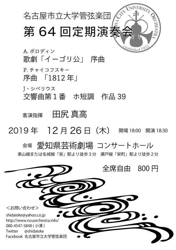 名古屋市立大学管弦楽団 第64回定期演奏会 19/12/26(木) 愛知県芸術劇場 コンサートホール シェア ツイート シベリウス :交響曲第1番/チャイコフスキー :序曲「1812年」/ボロディン:歌劇「イーゴリ公」序曲 公演情報 ジャンル オーケストラ 料金 全席自由-800円 表示できるチケット情報はありません詳しくはこちら キャスト&スタッフ 指揮 田尻真高 管弦楽 名古屋市立大学管弦楽団 お問い合わせ 名古屋市立大学管弦楽団(団長小澤) 公式サイト シェア ツイート