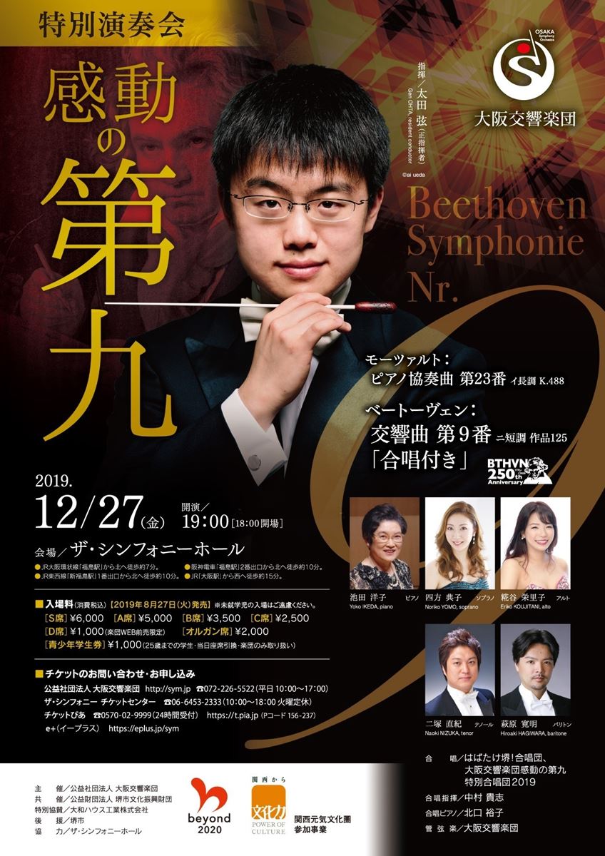 大阪交響楽団 特別演奏会 感動の第九 19/12/27(金) ザ・シンフォニーホール シェア ツイート モーツァルト:ピアノ協奏曲 第23番 イ長調 K.488/ベートーヴェン:交響曲 第9番 ニ短調 op.125「合唱付き」 公演情報 ジャンル オーケストラ S席・D席・青少年学生券は取り扱いなし。未就学児童は入場不可。 料金 A席-5,000円 B席-3,500円 C席-2,500円 オルガン席-2,000円 表示できるチケット情報はありません詳しくはこちら キャスト&スタッフ 指揮 太田弦 ピアノ 池田洋子 ソプラノ 四方典子 アルト 糀谷栄里子 テノール 二塚直紀 バリトン 萩原寛明 管弦楽 大阪交響楽団 合唱:はばたけ堺!合唱団、大阪交響楽団感動の第九特別合唱団2019 お問い合わせ 大阪交響楽団 公式サイト シェア ツイート