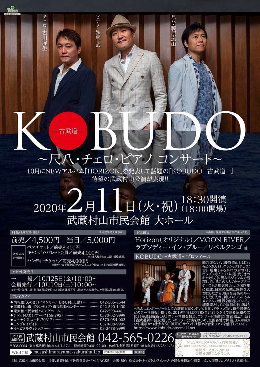 KOBUDO-古武道-~尺八・チェロ・ピアノ コンサート~ 20/2/11(火) 武蔵村山市民会館 大ホール シェア ツイート Horizon(オリジナル)/MOON RIVER/ラプソディー・イン・ブルー/リベルタンゴ 他 公演情報 ジャンル 器楽 室内楽 未就学児童は入場不可。 料金 全席指定-4,500円 表示できるチケット情報はありません詳しくはこちら キャスト&スタッフ チェロ 古川展生 ピアノ 妹尾武 尺八 藤原道山 KOBUDO-古武道ー(チェロ:古川展生/ピアノ:妹尾武/尺八:藤原道山) お問い合わせ 武蔵村山市民会館 公式サイト シェア ツイート