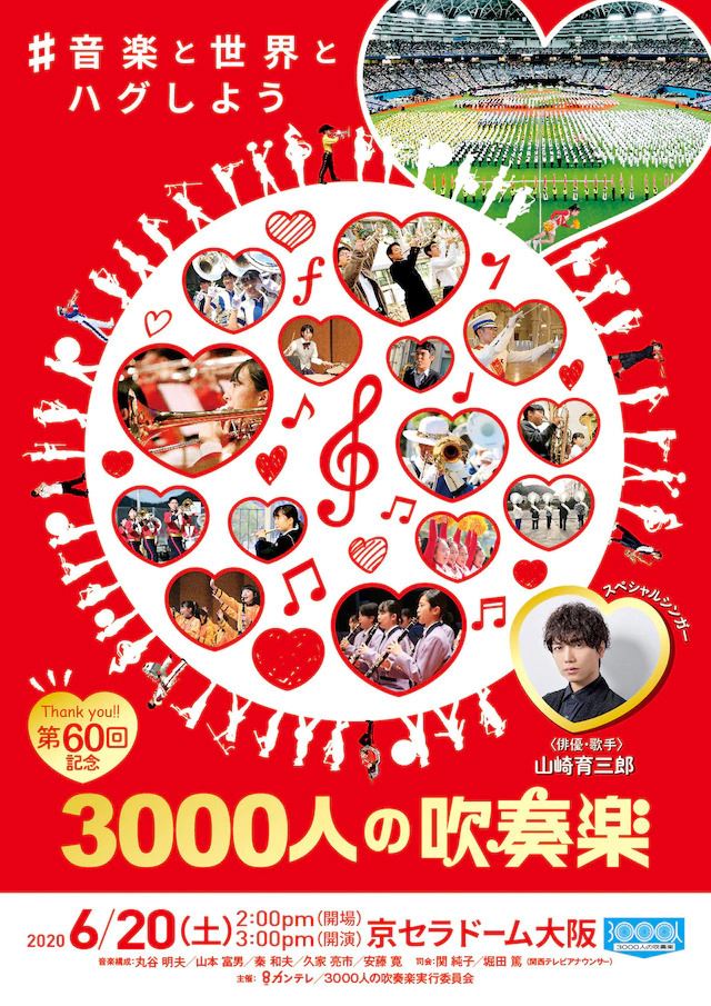 【公演中止】第60回 3000人の吹奏楽 20/6/20(土) 京セラドーム大阪 シェア ツイート 吹奏楽を愛する3000人が結集する、日本有数のロングランイベント「3000人の吹奏楽」。記念すべき第60回目となる今年の公演テーマは、『頑張れ音楽、頑張れ地球!』。 公演情報 ジャンル 吹奏楽 3歳以下は無料。但し、お席が必要な場合は有料。 料金 下段指定席-2,100円 上段指定席-2,100円 自由席-1,700円 表示できるチケット情報はありません詳しくはこちら キャスト&スタッフ 司会:関 純子、堀田篤/吹奏楽:豊能地区合同、大阪市立中学校合同、阪市立高校合同、泉南地区合同、尼崎地区合同、淡路地区合同、大阪府立淀川工科高等学校、早稲田摂陵高等学校、京都橘高等学校、武庫川女子大学附属中学校・高等学校、近畿大学、箕面自由学園高等学校、明浄学院高等学校、滝川第二高等学校/スペシャルシンガー:山崎育三郎 お問い合わせ 『3000人の吹奏楽』公演事務局(関西テレビ事業局内) 平日11:00~18:00 公式サイト シェア ツイート