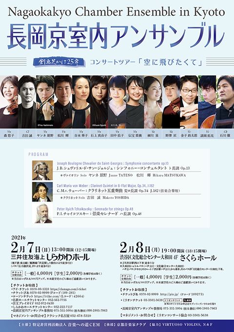 長岡京室内アンサンブル 21/2/7(日) 三井住友海上しらかわホール シェア ツイート 公演情報 ジャンル 器楽 室内楽 学生券は、入場時要証明書提示。未就学児童は入場不可。ご来場時にはマスクの着用・手洗い・消毒など十分な感染予防をお願いいたします。当日は検温にご協力ください。お時間に余裕をもってご来場ください。 料金 全席自由 一般-4,000円 全席自由 学生-2,000円 全席自由 学生-各種学校を除く 表示できるチケット情報はありません詳しくはこちら キャスト&スタッフ 出演 長岡京室内アンサンブル ヴァイオリン 森悠子 ヤンネ舘野 松川暉 クラリネット 吉田誠 お問い合わせ クラシック名古屋 公式サイト シェア ツイート
