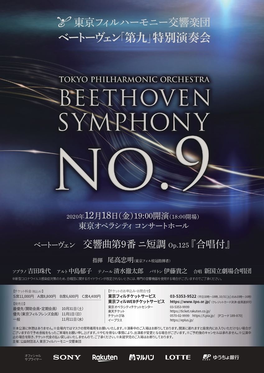 東京フィルハーモニー交響楽団 ベートーヴェン「第九」特別演奏会 20/12/18(金) 東京オペラシティ コンサートホール:タケミツメモリアル シェア ツイート ベートーヴェン:交響曲第9番 ニ短調『合唱付』 作品125 公演情報 ジャンル オーケストラ 小学生以上は入場可。 料金 S席-11,000円 A席-8,800円 B席-6,600円 C席-4,400円 表示できるチケット情報はありません詳しくはこちら キャスト&スタッフ 指揮 尾高忠明 管弦楽 東京フィルハーモニー交響楽団 ソプラノ 吉田珠代 アルト 中島郁子 テノール 清水徹太郎 バリトン 伊藤貴之 合唱 新国立劇場合唱団 お問い合わせ 東京フィルチケットサービス 公式サイト シェア ツイート