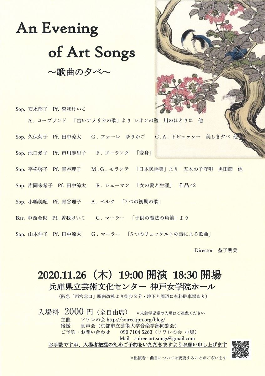 An Evening of Art Songs 20/11/26(木) 兵庫県立芸術文化センター 神戸女学院 小ホール シェア ツイート R.シュトラウス、クラース、シューベルト、オネゲル、ツェムリンスキーの歌曲より 公演情報 ジャンル 声楽 料金 自由-2,000円 キャスト&スタッフ ソプラノ:安永郁子、池口愛子、平松啓子、片岡未希子、久保菊子、小嶋美紀、山本伸子/バリトン:中西金也/ピアノ:曽我けいこ、市川麻里子、青谷理子、田中涼太 お問い合わせ ソワレの会(小嶋) 公式サイト シェア ツイート