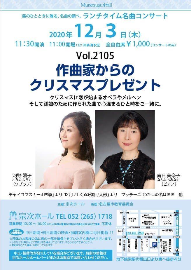 作曲家からのクリスマスプレゼント 20/12/3(木) 宗次ホール シェア ツイート クリスマスに恋が始まるオペラやメルヘン、そして孫娘のために作られた曲で心温まるひと時をご一緒に。 公演情報 ジャンル 声楽 料金 全自由席-1,000円 キャスト&スタッフ ソプラノ:河野陽子/ピアノ:南日美奈子 お問い合わせ 宗次ホールチケットセンター 公式サイト シェア ツイート
