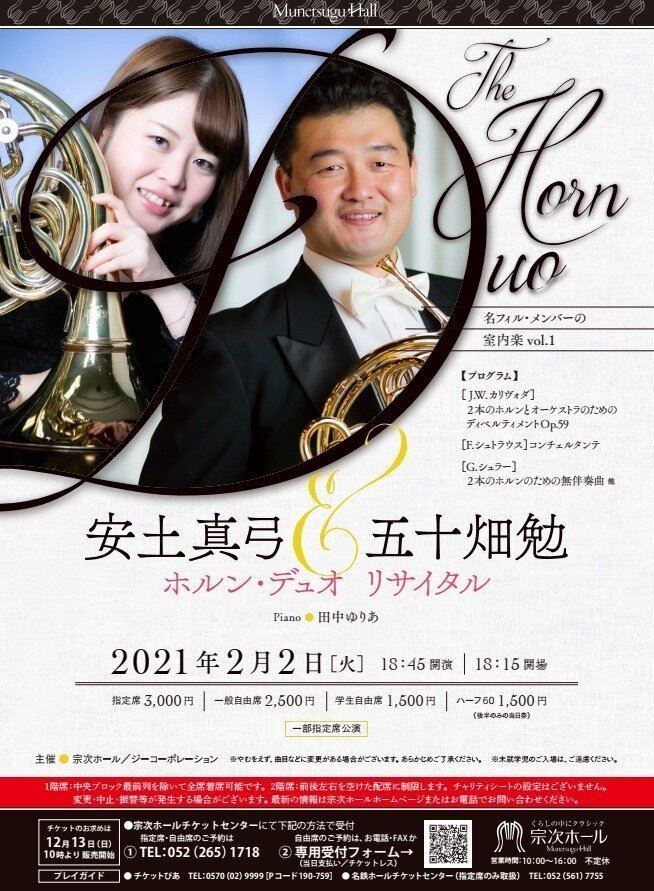 安土真弓&五十畑勉 ホルン・デュオ・リサイタル 21/2/2(火) 宗次ホール シェア ツイート J.W.カリヴォダ:2本のホルンとオーケストラのためのディベルティメント Op.59/F.シュトラウス:コンチェルタンテ/G.シュラー:2本のホルンのための無伴奏曲 他 公演情報 ジャンル 器楽 室内楽 未就学児童は入場不可。当面の間、感染対策として座席定員を減らして販売いたします。マスクを着用しない方の入館はお断りいたします。中止・振替等が発生する場合がございます。最新の情報は宗次ホールホームページまたは問合せ先までご確認ください。 料金 指定-3,000円 自由-2,500円 表示できるチケット情報はありません詳しくはこちら キャスト&スタッフ ホルン 安土真弓 ホルン:五十畑勉/ピアノ:田中ゆりあ お問い合わせ 宗次ホールチケットセンター 公式サイト シェア ツイート
