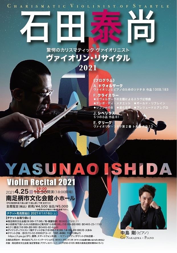 石田秦尚ヴァイオリンリサイタル2021 21/4/25(日) 南足柄市文化会館 小ホール シェア ツイート 公演情報 ジャンル 器楽 室内楽 未就学児童は入場不可。 料金 全席指定-4,500円 表示できるチケット情報はありません詳しくはこちら キャスト&スタッフ ヴァイオリン 石田泰尚 ピアノ 中島剛 お問い合わせ プレストインターナショナル シェア ツイート