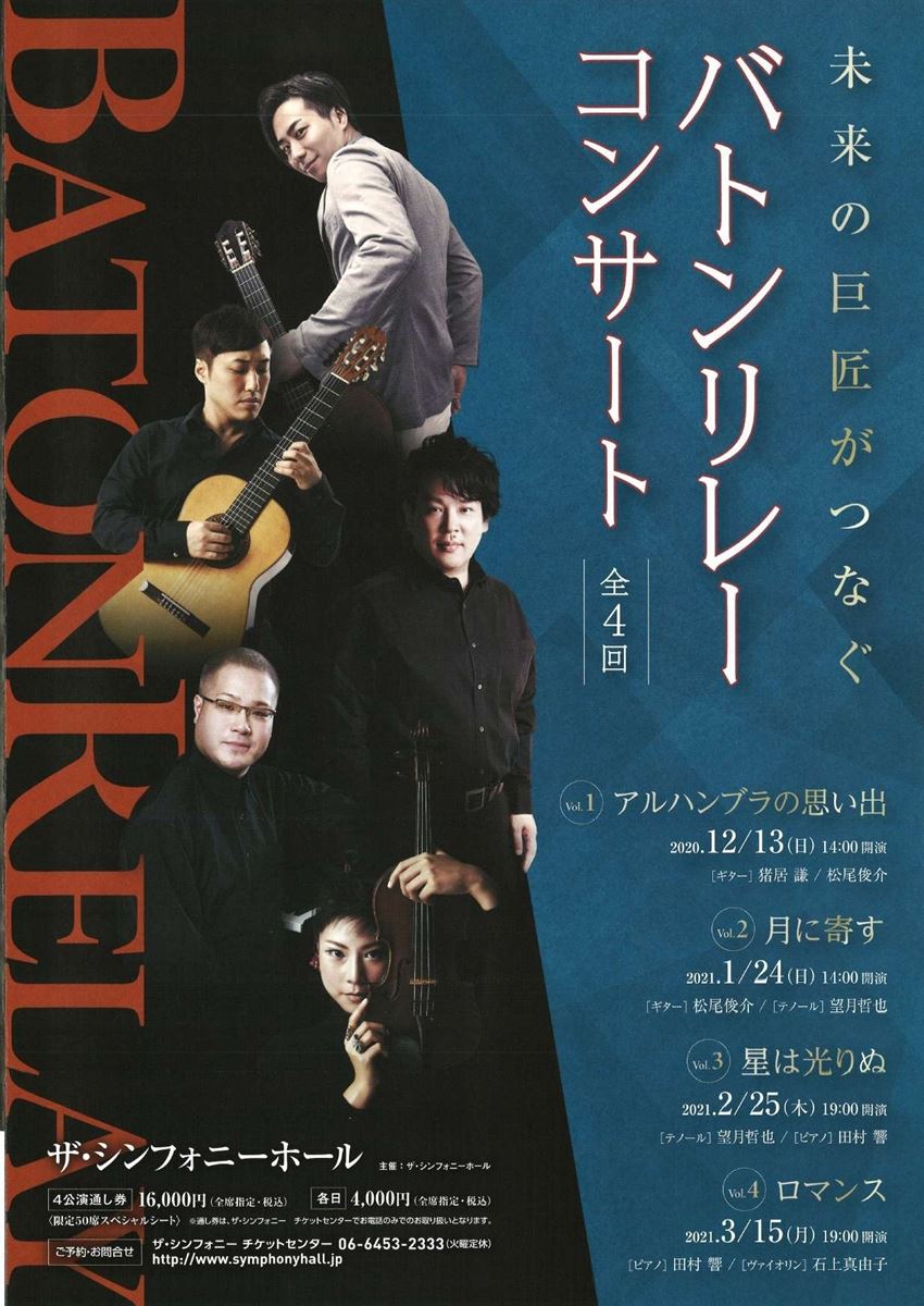 未来の巨匠がつなぐ バトンリレーコンサート Vol.2「月に寄す」 21/1/24(日) ザ・シンフォニーホール シェア ツイート シューベルト(松尾俊介編):月に寄す D 193/シューベルト(ラゴスニック編):羊飼いの嘆きの歌 D 121/シューベルト(ラゴスニック編):野ばら D 257/シューベルト(ディアベッリ編):魔王 D 328/シューベルト(松尾俊介編):白鳥の歌(全曲) D 957 公演情報 ジャンル 声楽 料金 全席指定-4,000円 キャスト&スタッフ ギター 松尾俊介 テノール 望月哲也 お問い合わせ ザ・シンフォニー チケットセンター 公式サイト シェア ツイート
