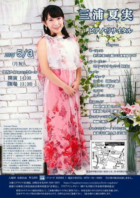 【公演中止】三浦夏実ピアノ・リサイタル 21/5/3(月) 伊丹アイフォニックホール(伊丹市立音楽ホール) メインホール シェア ツイート 公演情報 ジャンル ピアノ・鍵盤楽器 3歳未満は入場不可。新型コロナウイルス感染対策として、ご来場の際はマスクを着用下さい。花束やプレゼント等はお預りができませんので、お持ち込みはご遠慮下さい。 料金 全席自由-2,000円 表示できるチケット情報はありません詳しくはこちら お問い合わせ クライス音楽院 シェア ツイート