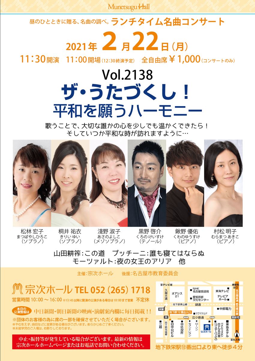 ザ・うたづくし! 平和を願うハーモニー 21/2/22(月) 宗次ホール シェア ツイート 山田耕筰:この道/プッチーニ:誰も寝てはならぬ/モーツァルト:夜の女王のアリア 他 公演情報 ジャンル 声楽 料金 全自由席-1,000円 キャスト&スタッフ ソプラノ:桐井祐衣、松林宏子/メゾソプラノ:淺野淑子/テノール:黒野啓介/ピアノ:鍬野優佑、村松明子 お問い合わせ 宗次ホールチケットセンター 公式サイト シェア ツイート