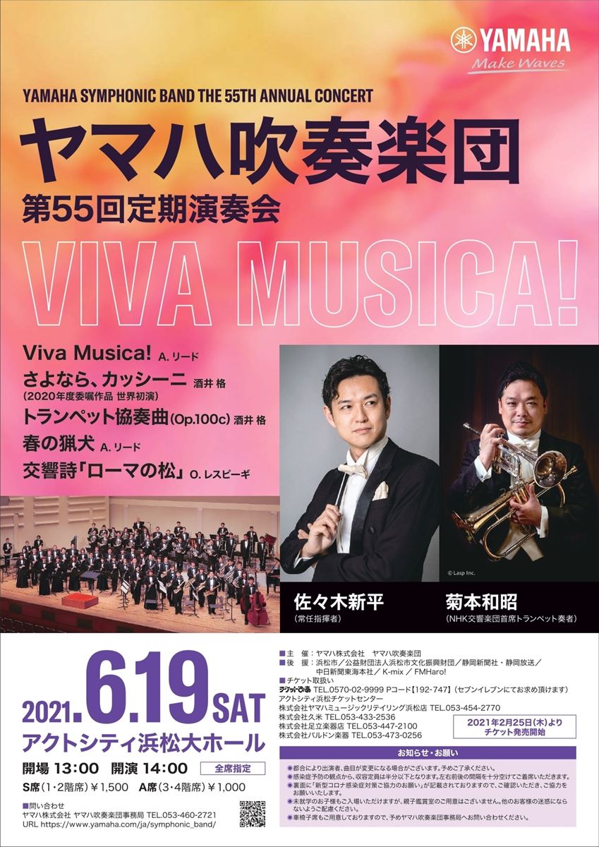 ヤマハ吹奏楽団 「第55回定期演奏会」 21/6/19(土) アクトシティ浜松 大ホール シェア ツイート 公演情報 ジャンル 吹奏楽 新型コロナウィルス感染防止のため、入場定員を減らし間隔をあけて配席しております。お席が連番ではお取りできません。予めご了承ください。ご来場前に必ず住所・氏名・連絡先を右の半券裏面にご記入お願い致します。3歳以下は、保護者膝上に限り無料。但し、席が必要な場合は有料。 料金 S席-1,500円 A席-1,000円 表示できるチケット情報はありません詳しくはこちら キャスト&スタッフ 指揮 佐々木新平 出演 ヤマハ吹奏楽団 トランペット 菊本和昭 お問い合わせ ヤマハ吹奏楽団事務局 公式サイト シェア ツイート