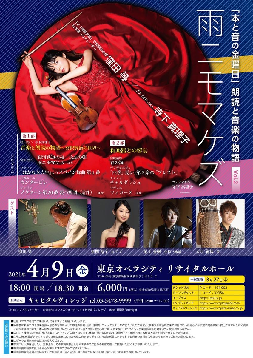 寺下真理子 本と音の金曜日 Vol.2「雨ニモマケズ」 21/4/9(金) 東京オペラシティ リサイタルホール シェア ツイート 公演情報 ジャンル 器楽 室内楽 料金 全席指定 S席-6,000円 表示できるチケット情報はありません詳しくはこちら キャスト&スタッフ ヴァイオリン 寺下真理子 ゲスト 窪田等 ピアノ 須関裕子 三味線 尾上秀樹 箏 大川義秋 お問い合わせ キャピタルヴィレッジ シェア ツイート