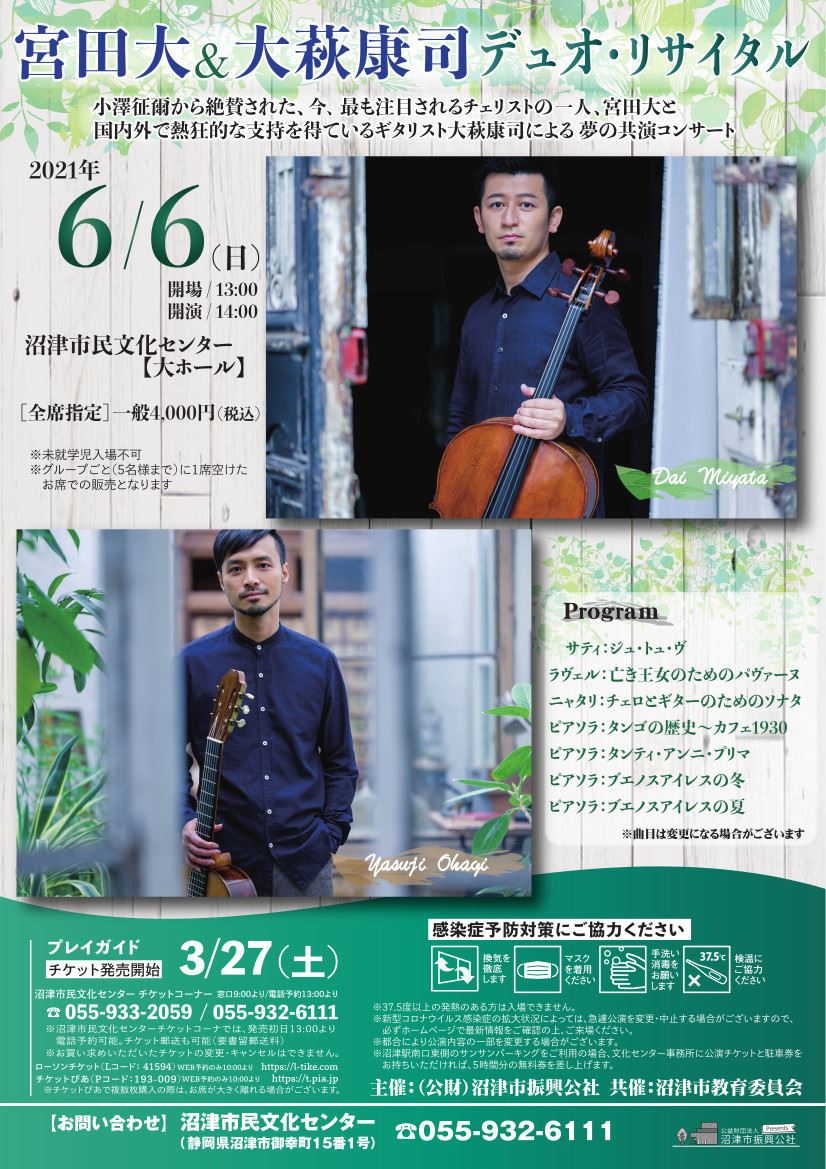 宮田大&大萩康司 デュオ・リサイタル 21/6/6(日) 沼津市民文化センター 大ホール シェア ツイート 公演情報 ジャンル 器楽 室内楽 未就学児童は入場不可。新型コロナウイルス感染防止のため、入場定員を減らし、間隔をあけて配席しております。複数枚購入の際は、席が大きく離れる場合がございます。 料金 一般-4,000円 表示できるチケット情報はありません詳しくはこちら キャスト&スタッフ チェロ 宮田大 ギター 大萩康司 お問い合わせ 沼津市民文化センター シェア ツイート