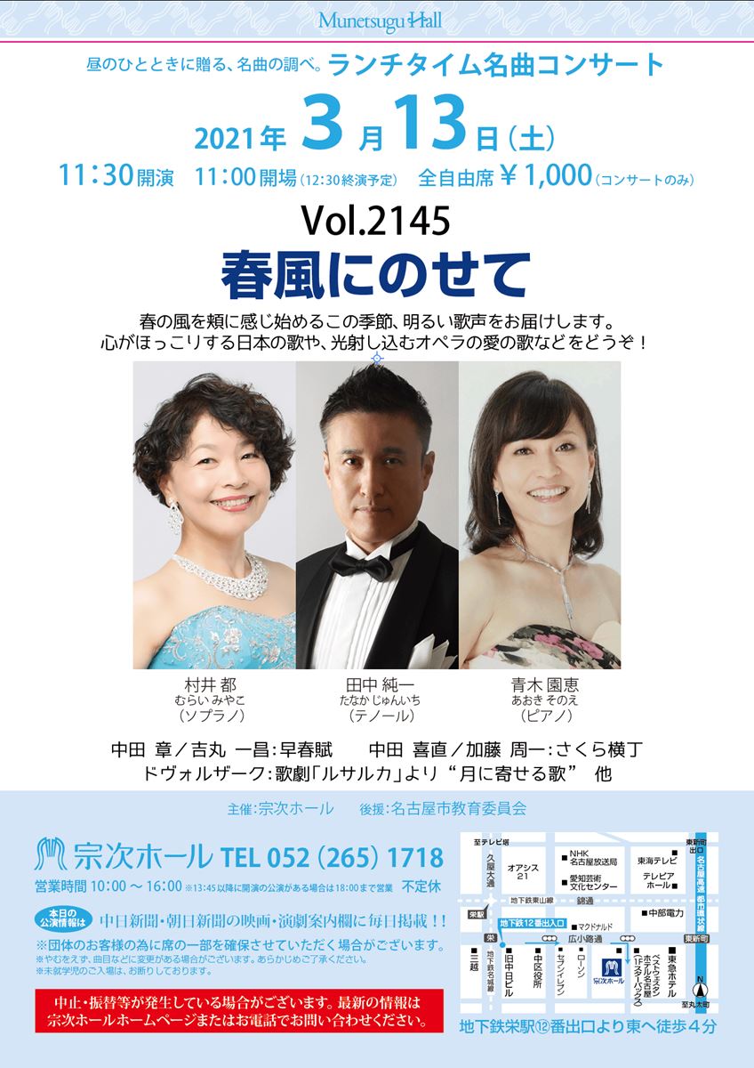 春風にのせて 21/3/13(土) 宗次ホール シェア ツイート 春の風を頬に感じ始めるこの季節、明るい歌声をお届けします。心がほっこりする日本の歌や、光射し込むオペラの愛の歌などをどうぞ! 公演情報 ジャンル 声楽 料金 全自由席-1,000円 キャスト&スタッフ ソプラノ:村井都/テノール:田中純一/ピアノ:青木園恵 お問い合わせ 宗次ホールチケットセンター 公式サイト シェア ツイート