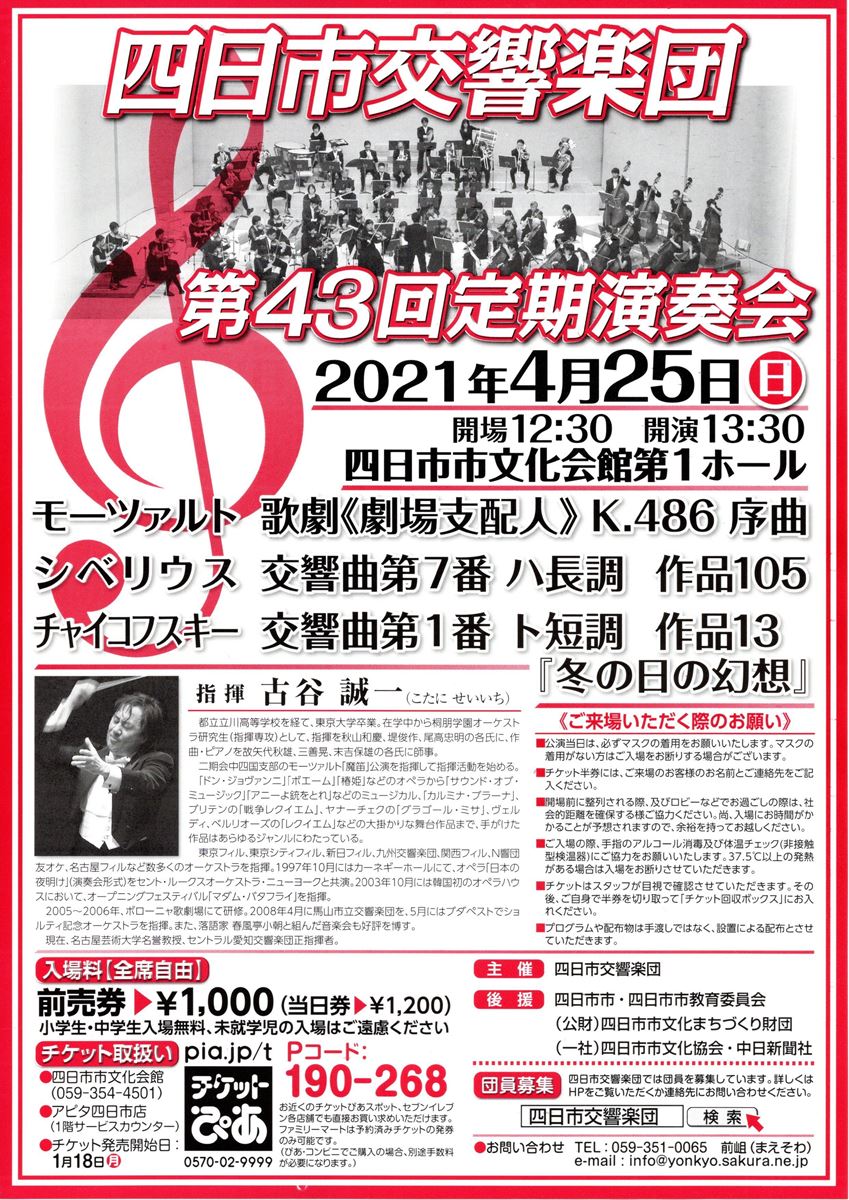 四日市交響楽団 第43回定期演奏会 21/4/25(日) 四日市市文化会館 第1ホール シェア ツイート 公演情報 ジャンル オーケストラ 小中学生無料。未就学児童は入場不可。チケット半券に来場者の氏名・連絡先をご記入の上ご来場ください。 料金 全自由席-1,000円 表示できるチケット情報はありません詳しくはこちら キャスト&スタッフ 指揮 古谷誠一 管弦楽 四日市交響楽団 お問い合わせ 四日市交響楽団 前岨 公式サイト シェア ツイート