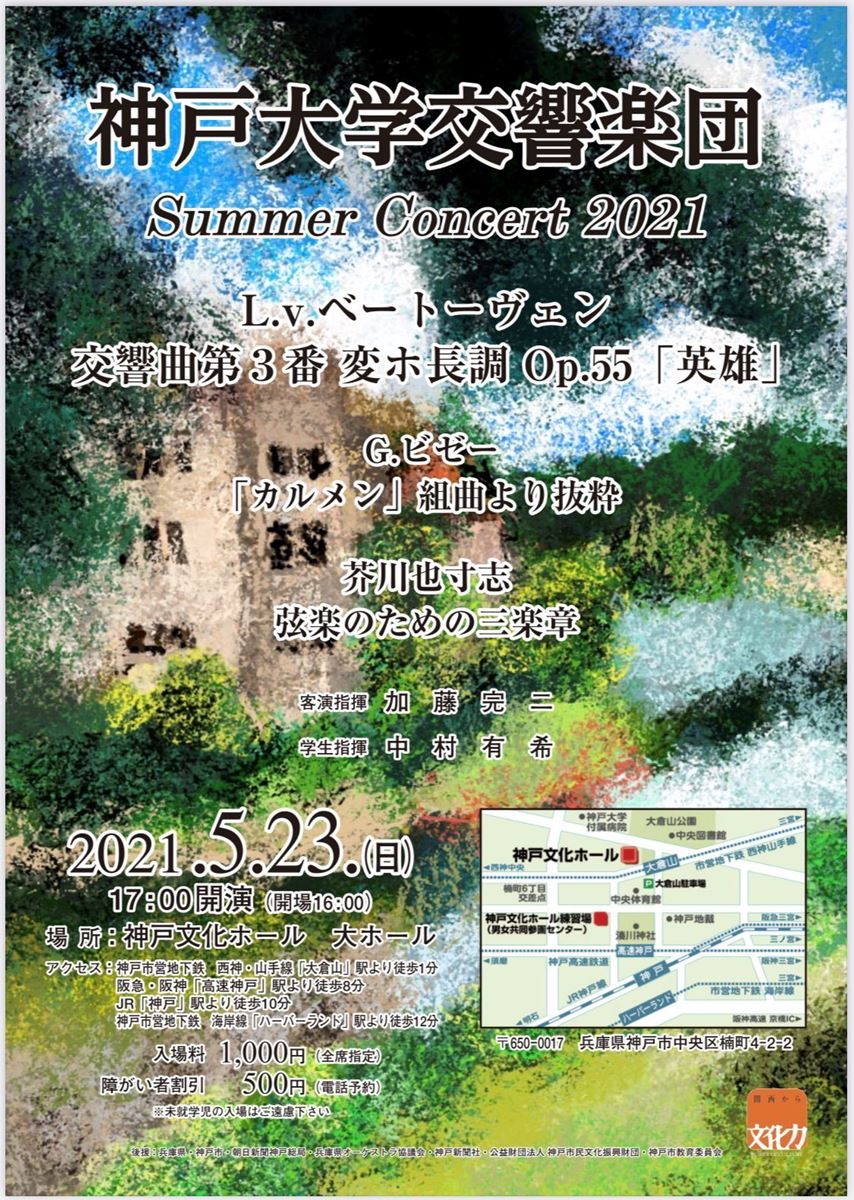【公演中止】神戸大学交響楽団 Summer Concert 2021 21/5/23(日) 神戸文化ホール 大ホール シェア ツイート L.v.ベートーヴェン:交響曲第3番 変ホ長調 Op.55「英雄」/G.ビゼー:『カルメン』組曲より抜粋/芥川也寸志:弦楽のための三楽章 公演情報 ジャンル オーケストラ 未就学児の入場はご遠慮願います。障がい者割引をご利用の方は問い合わせ先の電話番号までご連絡下さい。こちらのURLから感染症対策について必ずご確認ください。http://www.kobeusym.info/ 料金 全席指定-1,000円 表示できるチケット情報はありません詳しくはこちら キャスト&スタッフ 指揮 加藤完二 管弦楽 神戸大学交響楽団 学生指揮者:中村有希 お問い合わせ 神戸大学交響楽団広報担当 千種佳奈 公式サイト シェア ツイート