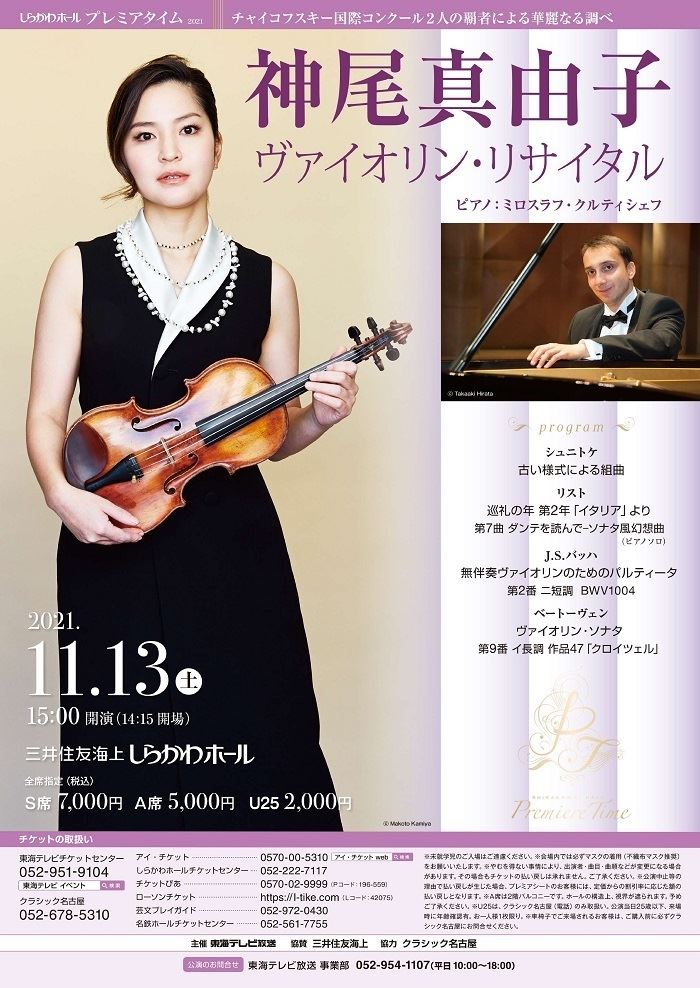 神尾真由子 ヴァイオリン・リサイタル 21/11/13(土) 三井住友海上しらかわホール シェア ツイート チャイコフスキー国際コンクール2人の覇者による華麗なる調べ 公演情報 ジャンル 器楽 未就学児童は入場不可。ご来場の際にはマスクの着用をお願いいたします。マスクを着用でないお客様のご入場はお断りさせて頂きます。発熱があり、検温の結果、平熱より明らかに高い場合、もしくは37.5℃以上の熱があった場合や、のどの痛み、倦怠感、息苦しさなどの風邪症状、嗅覚障害や味覚障害等、体調にご不安がある方はご来場をご遠慮ください。 料金 S席-7,000円 A席(バルコニー席)-5,000円 表示できるチケット情報はありません詳しくはこちら キャスト&スタッフ ヴァイオリン 神尾真由子 ピアノ:ミロスラフ・クルティシェフ お問い合わせ 東海テレビ放送事業部 平日10:00~18:00 公式サイト シェア ツイート